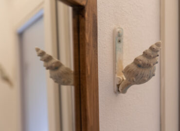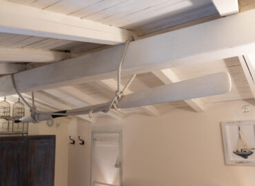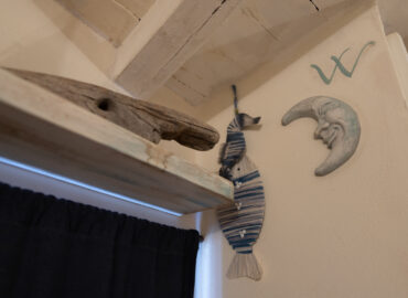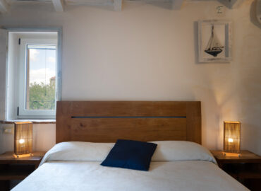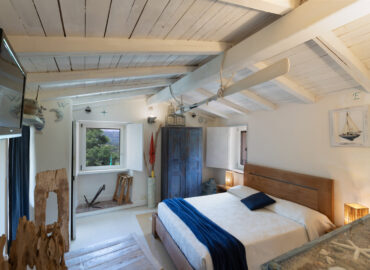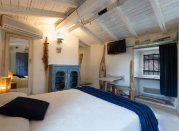This room is named Sea Room for its decor, really recovered from Liguria sandy shores or from the small markets of the coast. The room boasts a little terrace facing the Pentagonal Tower and the underlying little deconsecrated church, nowadays used on Friday evenings by the village musical band. Sometimes you can hear their pleasant notes in the stillness of the village.